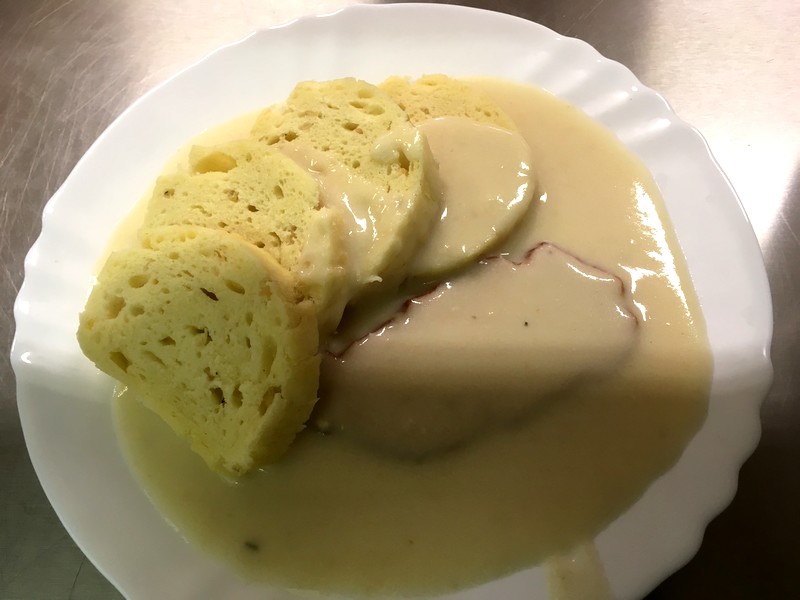 Hovězí jazyk, křenová omáčka, houskový knedlík