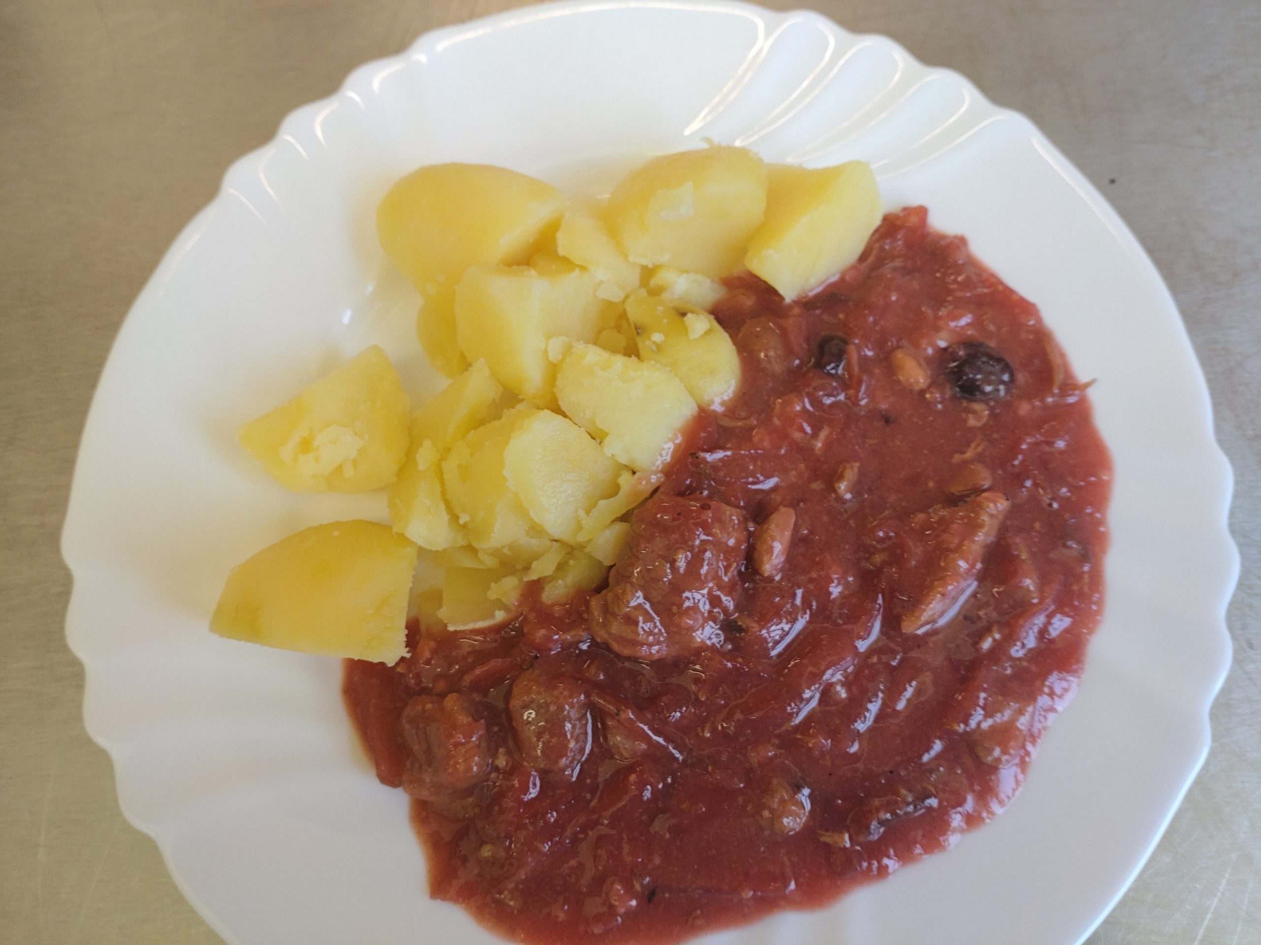 Vepřové kousky, brambory, zelí z červené řepy