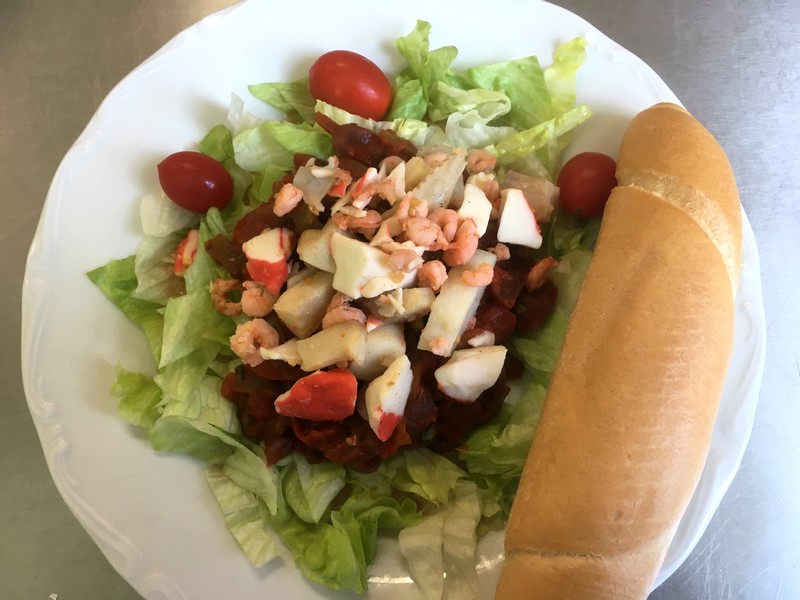 Rybí salát, zelenina, pečivo