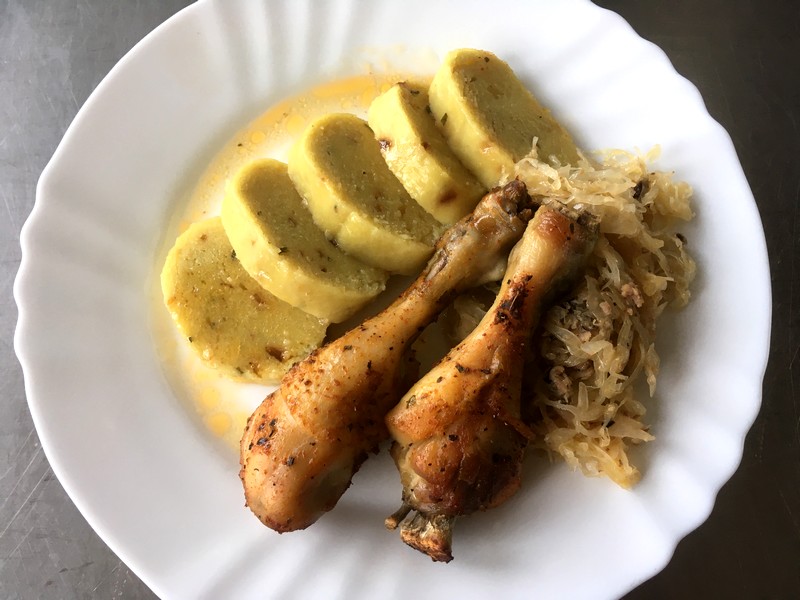 Kuřecí paličky na zelí, bramborový knedlík