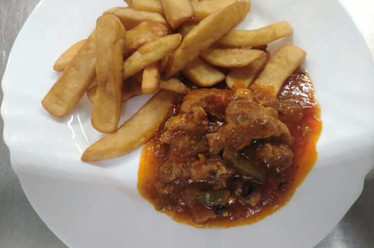 Hovězí guláš s fazolemi a kukuřicí, rýže