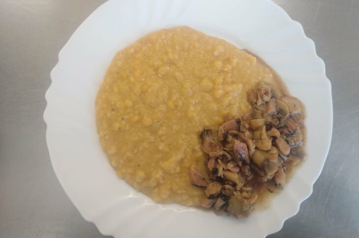 Hrachová kaše s cibulkou, slaninou a žampióny
