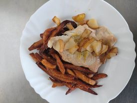 Krůtí maso na hruškách, batátové hranolky